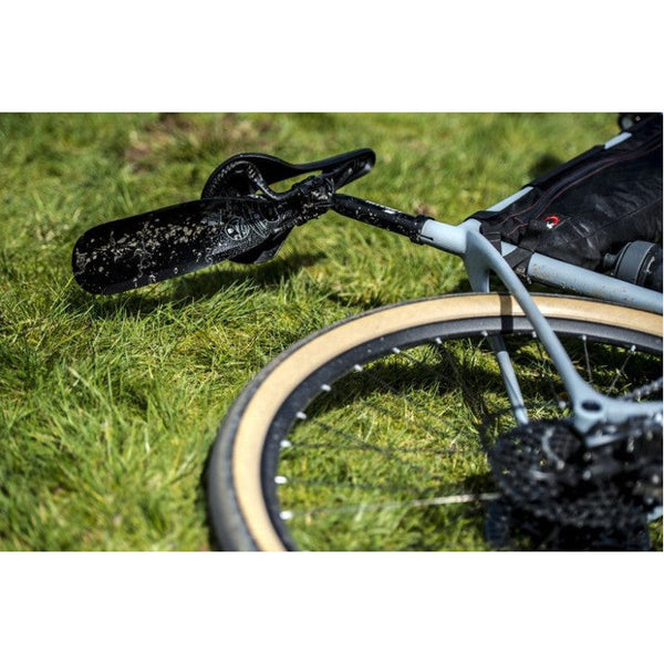 Breiter Spritzschutz zur werkzeugfreien Befestigung an den Sattelstreben, auch Carbon